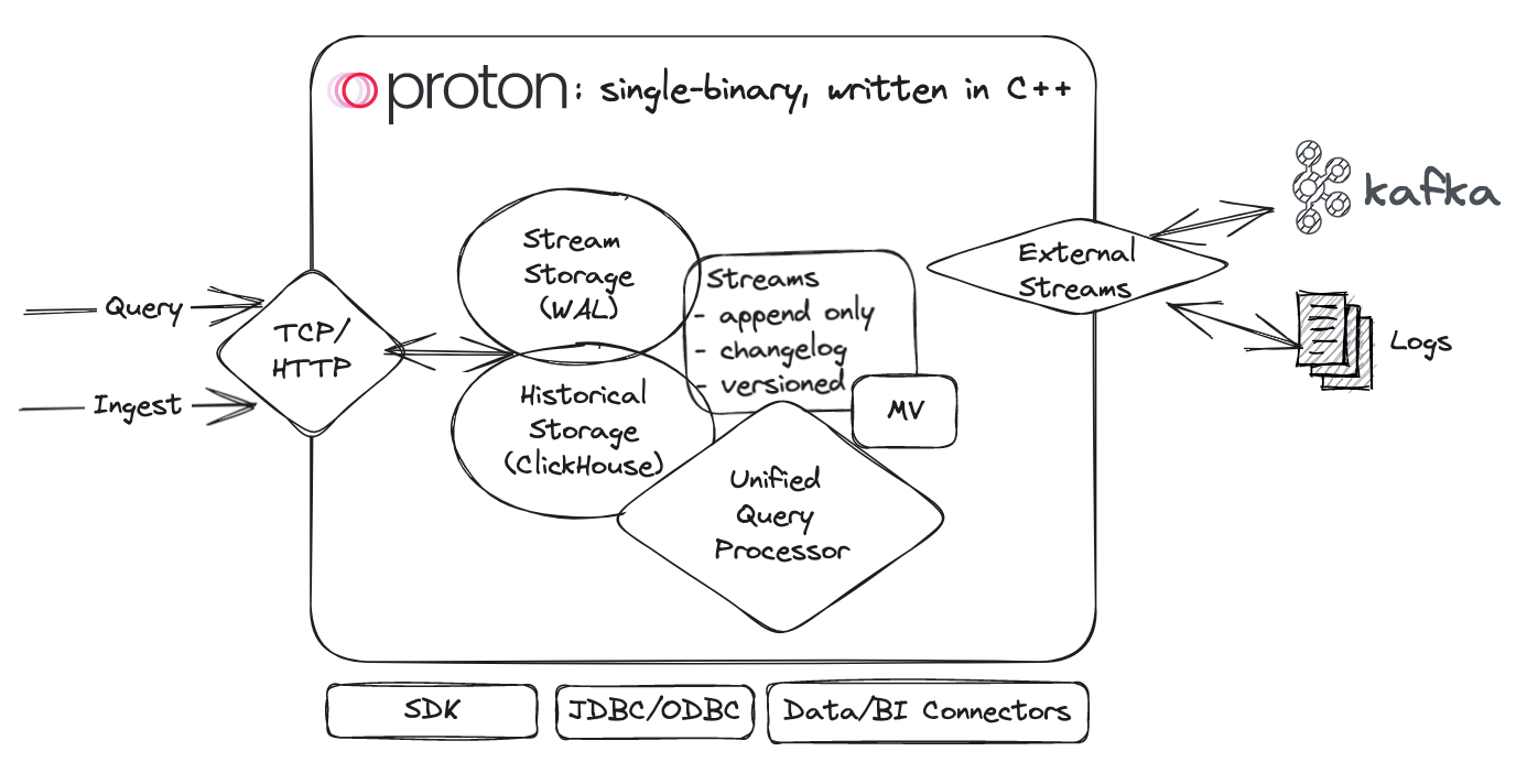 Simplicity. In the era of the Modern Data Stack, it’s common for data teams to adopt either the Lambda or the Kappa architecture to handle real-time and batch processing separately, which require multiple systems (such as Apache Kafka, Apache Flink, Apache Spark, ClickHouse, or Snowflake) with high cost and maintenance effort. Proton can be deployed as simply as a single binary, without JVM or any other external services dependency, to replace the complex stacks (such as Kafka->Flink->Druid). Proton also provides a smooth developer experience, primarily with SQL, to query both historical and streaming data.
